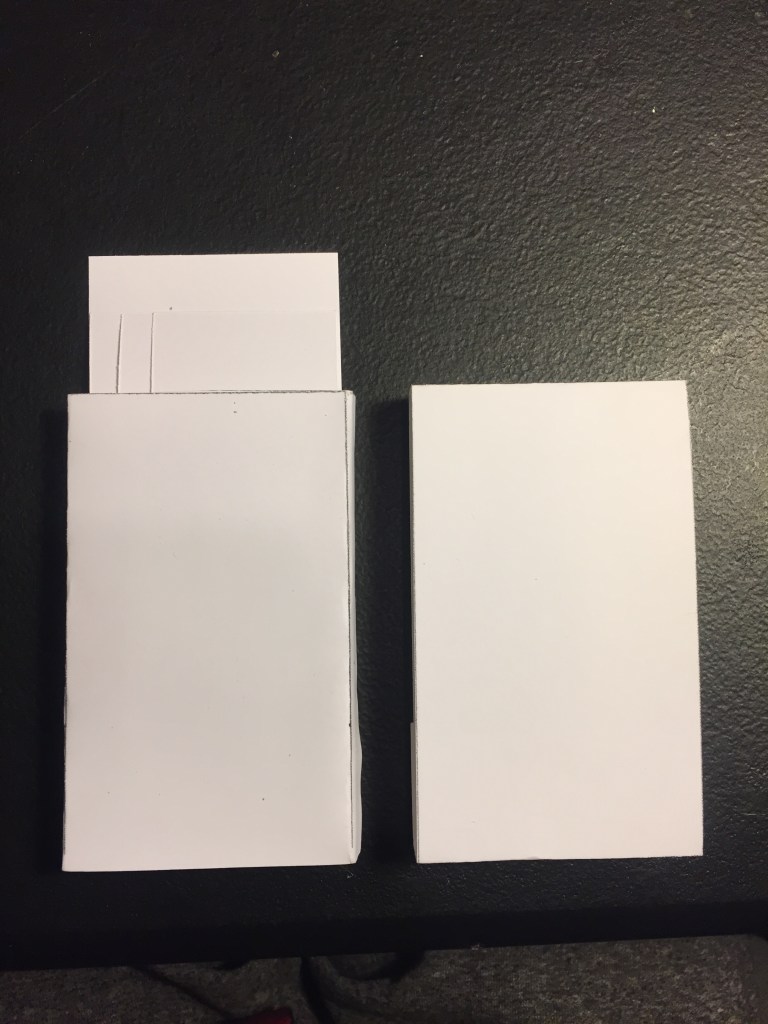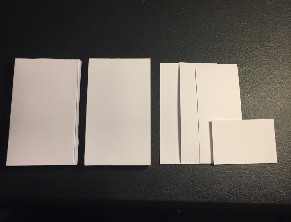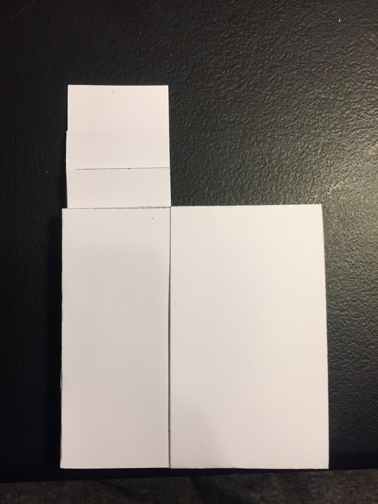 Pictures of examples, template, and guide below. There is a download to a zip file containing the template and the guide at the base of this post. The guide shows instructions for when and where to cut on each line. Printing on cardstock is highly recommended. I have used 110lb (199 g/m^2) weight cardstock for these templates and it holds up well. Be aware that many printers will attempt to scale the image down to ~96% by default–print at 100% scaling to ensure that the dimensions are correct.