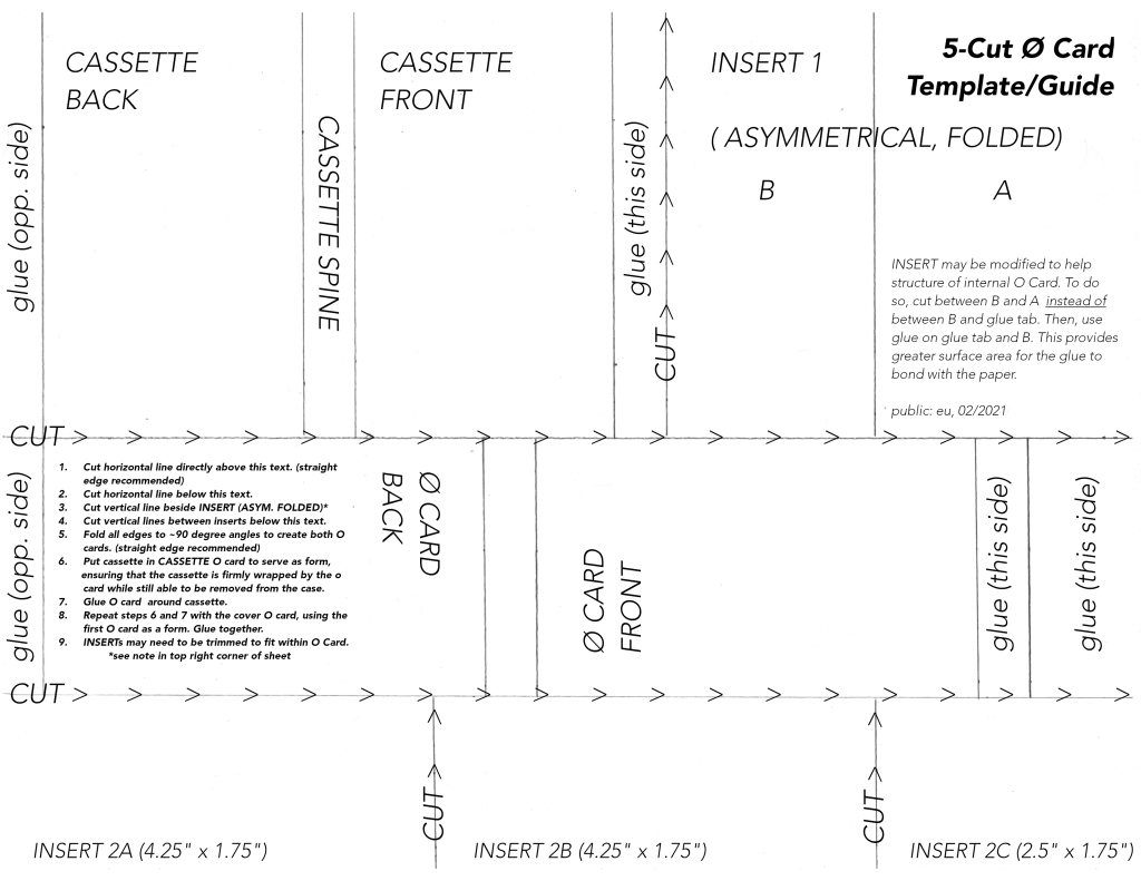 These templates (CD-R and 3″ CD-R forthcoming) are designed to seize and gift the means of production directly to artists and audience. This template was designed for a (forthcoming) release project that requires the purchaser of the cassette to assemble the case themselves, as a way to alienate or disassociate the idea of a release as a product purchased in its final form; instead, requiring effort and care on the part of the buyer to engage with the production of the work to ‘complete’ it as a physical object.